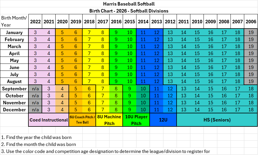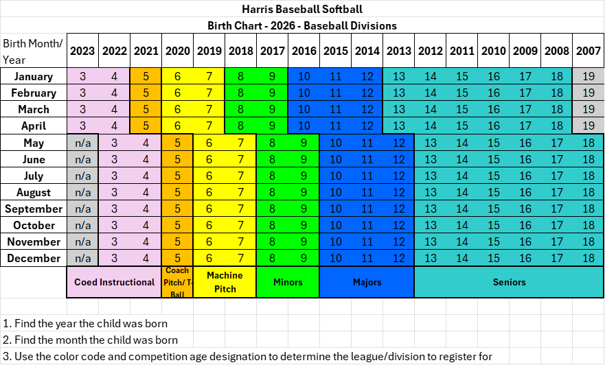 *Baseball league age is based on April 30th of the current year. To find your player's league age, ask yourself, "How old will my player be on April 30th of the season year?"